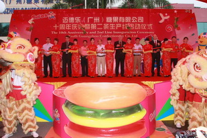 下午的啟動儀式活動現(xiàn)場鑼鼓喧天、鮮花簇?fù)?、高朋滿座?,F(xiàn)場布置讓來賓一進(jìn)場馬上感受到備受尊重、創(chuàng)新親切的氣氛。2層樓高的品牌氣模公仔迎賓,3D立體漢堡包舞臺效果,特別設(shè)計(jì)的十年品牌走廊,使每位來賓都有機(jī)會充分了解公司的文化和歷程。邁德樂集團(tuán)的創(chuàng)始人邁德 樂 先生做了熱情洋溢的講話。番禺區(qū)副區(qū)長 黎偉棠 先生在儀式上分別致辭。對邁德樂(廣州)糖果有限公司第二條生產(chǎn)線項(xiàng)目給予肯定,并希望該生產(chǎn)線早日投入生產(chǎn),為番禺城市繁榮發(fā)展作出貢獻(xiàn),提升城市價值。