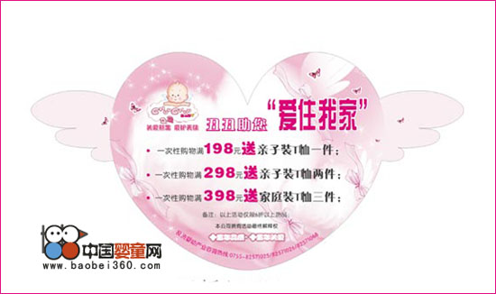 B、一次性購物滿298元送親子裝兩件(一大一小共2件)及全家福海報(bào)攝影券一張(憑券到指定攝影公司拍攝全家福海報(bào),此攝影券暫定深圳使用)