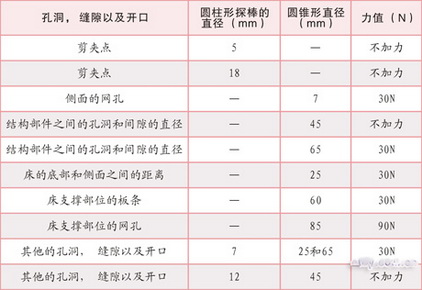 尺寸安全:童床的尺寸安全除了包含一般的孔洞、縫隙的尺寸、繩索的長度、移動部件之間的縫隙尺寸以及童床附件上的尺寸安全之外,還包含床護(hù)欄與床墊支撐系統(tǒng)之間的高度,床板條之間的寬度等尺寸的安全要求。以上這些尺寸對于兒童有剪夾手指腳趾,以及卡住軀干或者頭部的危險,還有意外翻出的危險。在國外標(biāo)準(zhǔn)中,對這方面的要求是很多的,以en 716為例,包括各種孔洞、縫隙以及開口的測量器具和需要施加的力等均有要求,見下表: