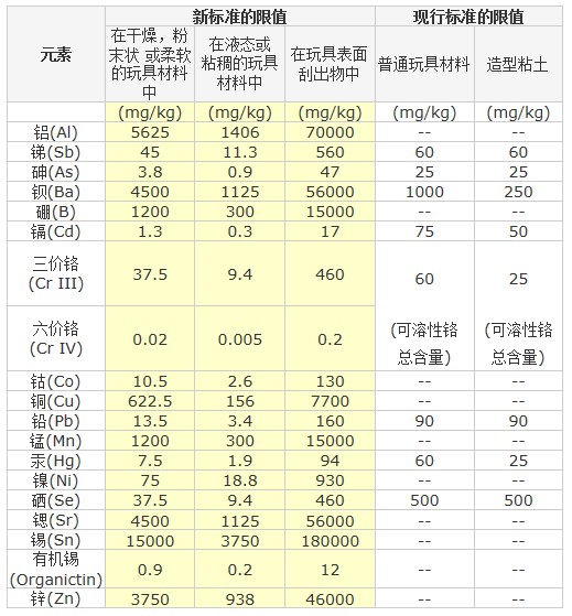 現(xiàn)行的歐盟玩具指令88/378/EEC于20多年前開始實施。在過去的20年中,玩具產(chǎn)品發(fā)生了巨大變化,現(xiàn)行指令中要求的8項受限制可溶性重金屬巳不能滿足玩具安全的需要。在新的指令中,受限制的可溶性重金屬大幅增加至19項。附表為在不同材質(zhì)中規(guī)定的限量。