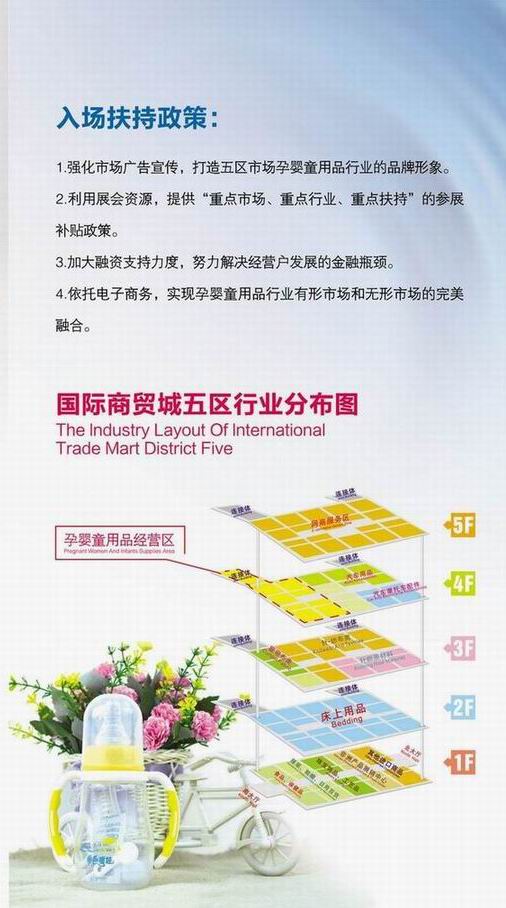 去年,廣東省孕嬰童用品協(xié)會組織了兩個考察組對義烏專業(yè)市場進行考察,參加人員有孕嬰童服裝、洗護、用品、玩具等知名品牌企業(yè)領導人,大家對在義烏商品城設立孕嬰童產(chǎn)品專區(qū)很感興趣。品牌商和生產(chǎn)制造企業(yè)可以通過該區(qū),作為開拓世界貿(mào)易的便捷窗口,擴大經(jīng)營渠道,把品牌和產(chǎn)品推向世界各地,建立國際貿(mào)易的新基地。