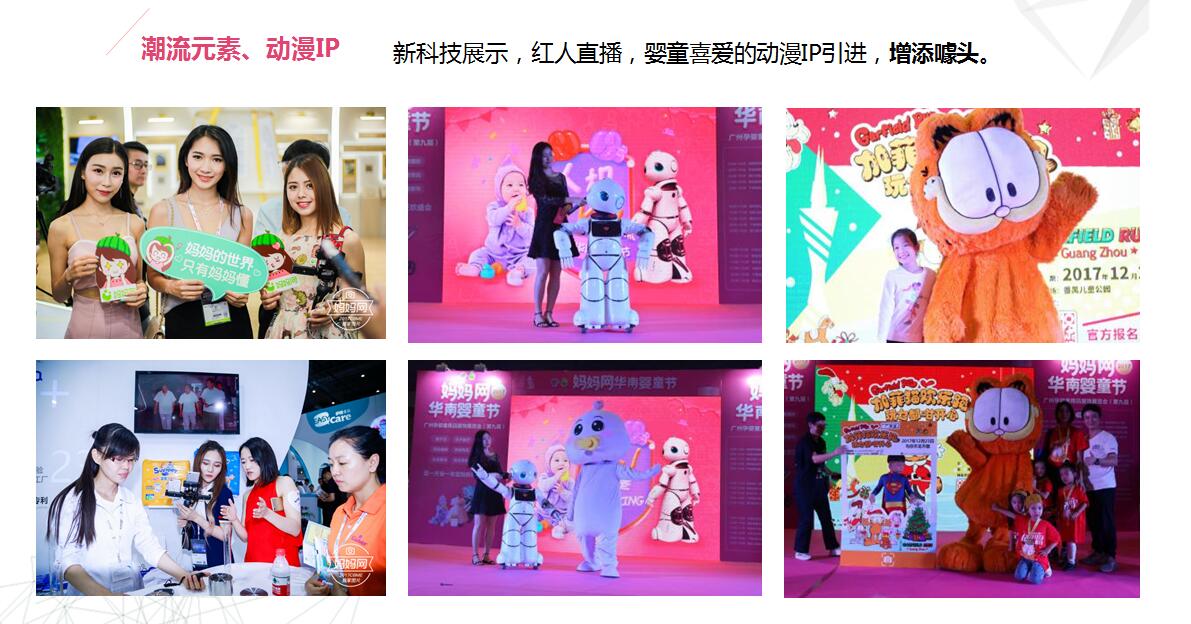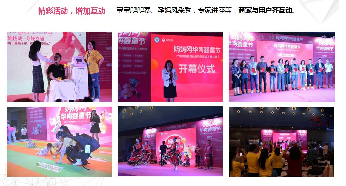 2018年展會全面升級,參展企業(yè)除了嬰童用品、服飾、玩具和教育等展區(qū)外,還增加香港嬰童用品展區(qū)、保健食品展區(qū)、禮品展區(qū)、兒童時裝秀場等?,F(xiàn)場活動引入更多當(dāng)下新鮮、時尚、流行的元素,智能機(jī)器人、AR技術(shù)進(jìn)行親子互動、各種精心設(shè)計寶寶爬爬賽、親子活動,舉辦論壇和新品發(fā)布、評選“消費者口碑之選”獎項等,讓 “華南嬰童節(jié)”在展示母嬰行業(yè)新產(chǎn)品、新技術(shù)的同時,成為一場真正可以邊逛邊玩的“親子時光趴”,為展會倍增亮色。 .jpg)